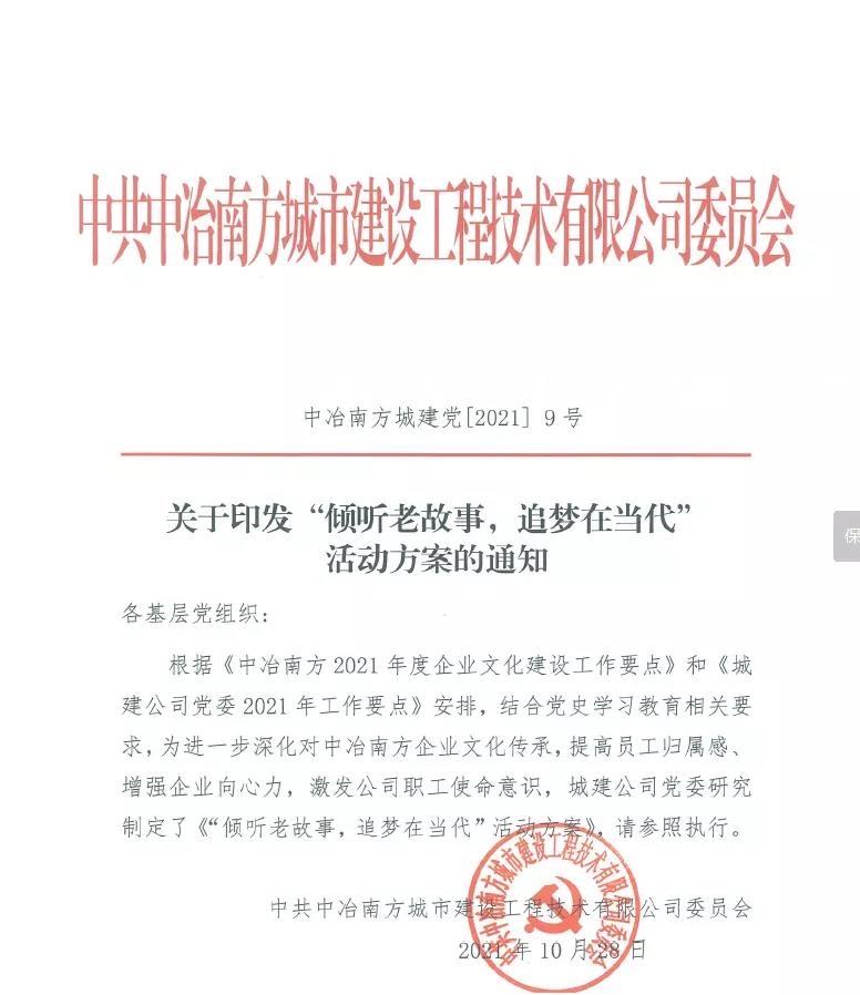 10月-11月,将傳承中冶南方優秀企業文化和加強黨風廉政建設有機結合,組織企業文化建設及黨風廉政建設知識線上答題,開展“傾聽老故事,追夢在當代”活動,重溫中冶南方創業、改革、發展的曆史,引導員工加深對中冶南方企業文化的理解與認同,廉潔從業,彙聚推動企業發展的強大力量。