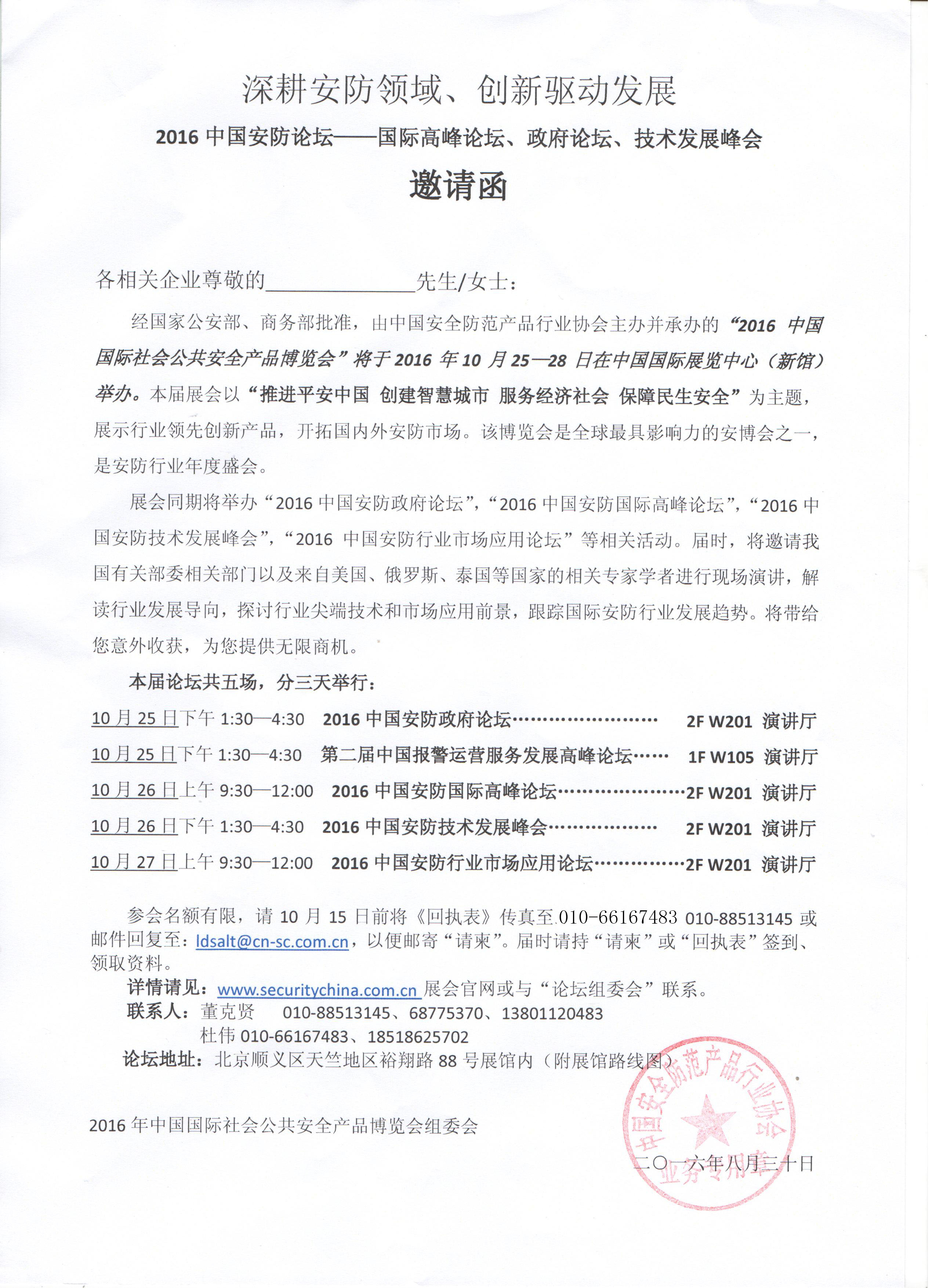 2016中國安防論壇 - 國際高峰論壇、政府論壇、技術發展峰會邀請函