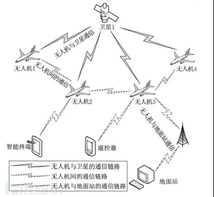 無人機系統主要由三部分組成,包含無人機、地面站以及傳輸信息的通信鍊路組成。其中,無人機部分包含動力系統、主控制器、通信鍊路模塊、傳感器、任務執行單元。地面站部分包含遙控器、智能終端、通信鍊路模塊。控制命令通過地面站傳輸到無人機,無人機采集的數據及其運行數據也會傳輸到地面站。通信鍊路部分包括無人機與地面站之間的通信鍊路、衛星通信鍊路和無人機到無人機通信鍊路。