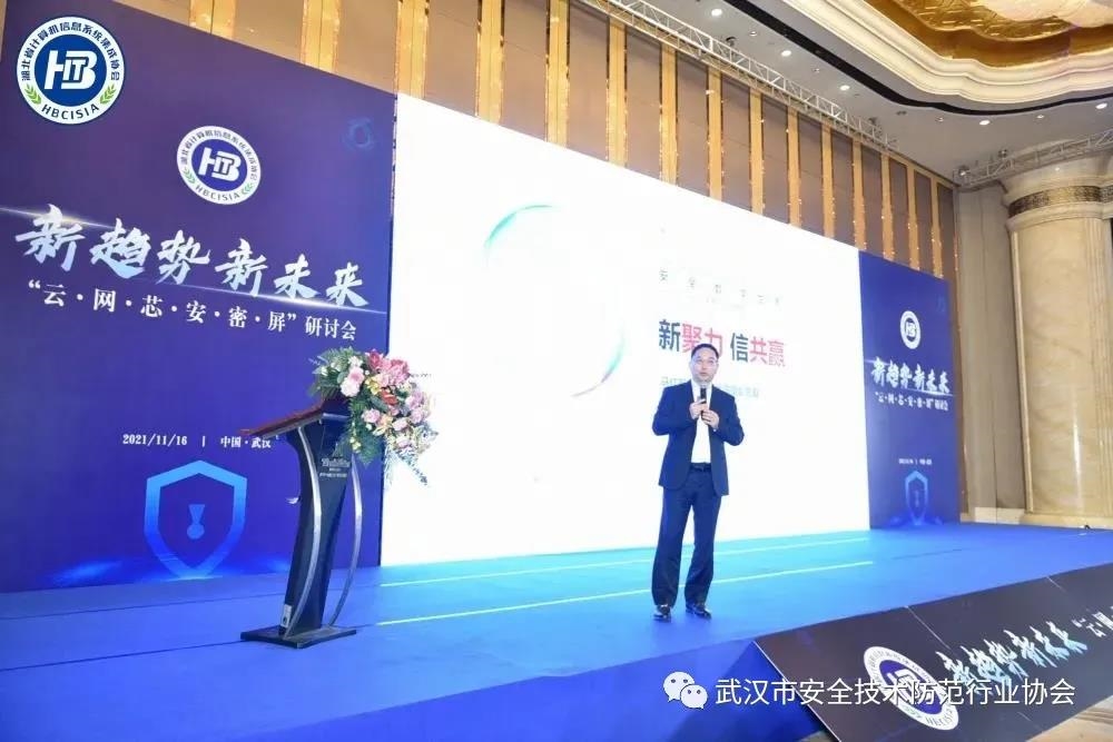 2021年11月16日,在湖北省工商業聯合會的指導下,友好單位湖北省信息網絡安全協會、武漢市安全技術防範行業協會的支持下,同時邀請行業專家學者、業内安全廠商、信息系統集成行業廠商等300餘人共同參會,探讨關于雲計算、網絡安全、信息安全、密碼應用、安全服務、電子屏幕等技術發展趨勢和未來,由湖北省計算機信息系統集成協會主辦的“新趨勢,新未來——雲·網·芯·安·密·屏”研讨會在武漢圓滿落幕。參加會議并出席的有湖北省工商聯高小堆部長、湖北省信息網絡安全協會劉莉主任。協會副會長胡愛春、秘書長陳虎及衆會員單位代表參加了本次會議。