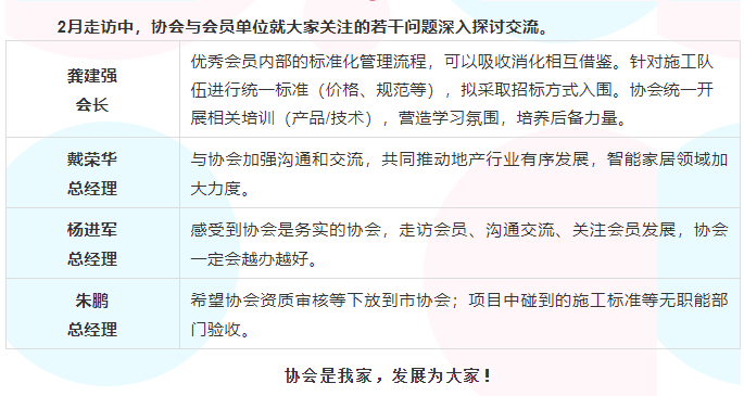 2月23日,襄陽市安全技術防範行業協會(以下簡稱“協會”)會長陳志河及秘書長周滿一同走訪湖北雲控九州信息技術有限公司,與戴榮華總經理溝通交流,深入了解地産市場現狀,智能家居發展趨勢和走向。