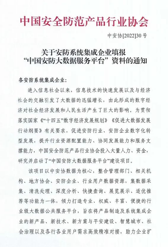【通知】 關于安防系統集成企業填報“中國安防大數據服務平台”資料的通知
