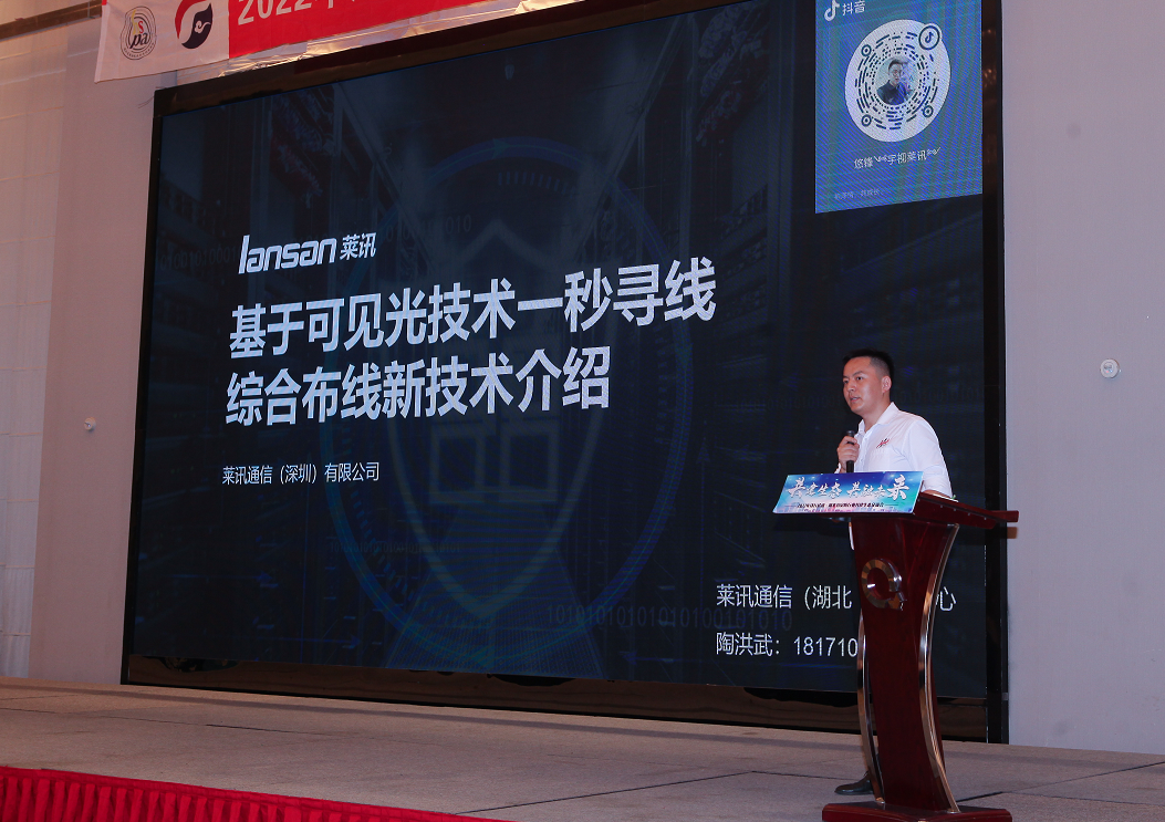 萊訊通信(深圳)有限公司湖北運營中心銷售總監陶洪武分享《可見光一秒尋線綜合布線應用解決方案》。lansan萊訊是全球可見光一秒尋線整體解決方案首創者,通過産品兩端發光的方式,解決了在數據中心、大型網絡中針對綜合布線尋線效率低,尋線成本高的問題,一秒鐘找到網線、信息模塊、銅跳線、光纖跳線等産品的兩端對應關系,該方案填補了行業的産品、市場、行業标準的空白,解決了當前智慧安防布線的發展趨勢及面臨的主要難題和整體解決方案。