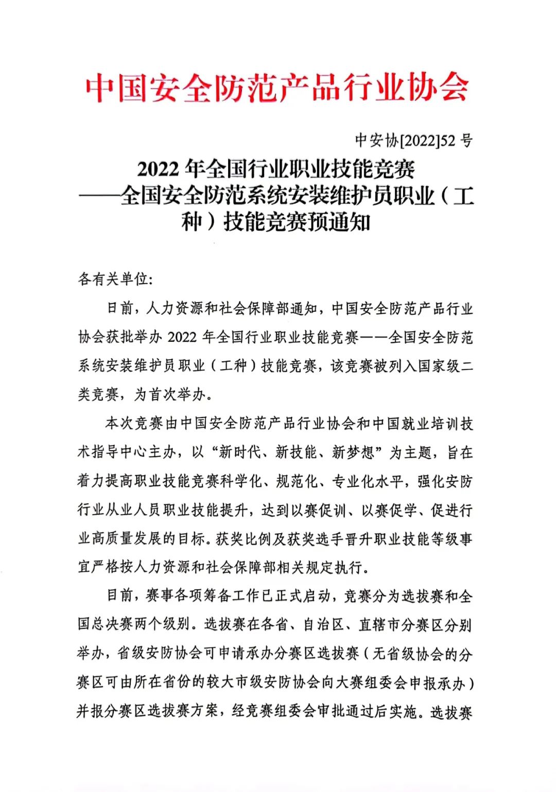 【通知】2022年全國行業職業技能競賽——全國安全防範系統安裝維護員職業(工種)技能競賽預通知