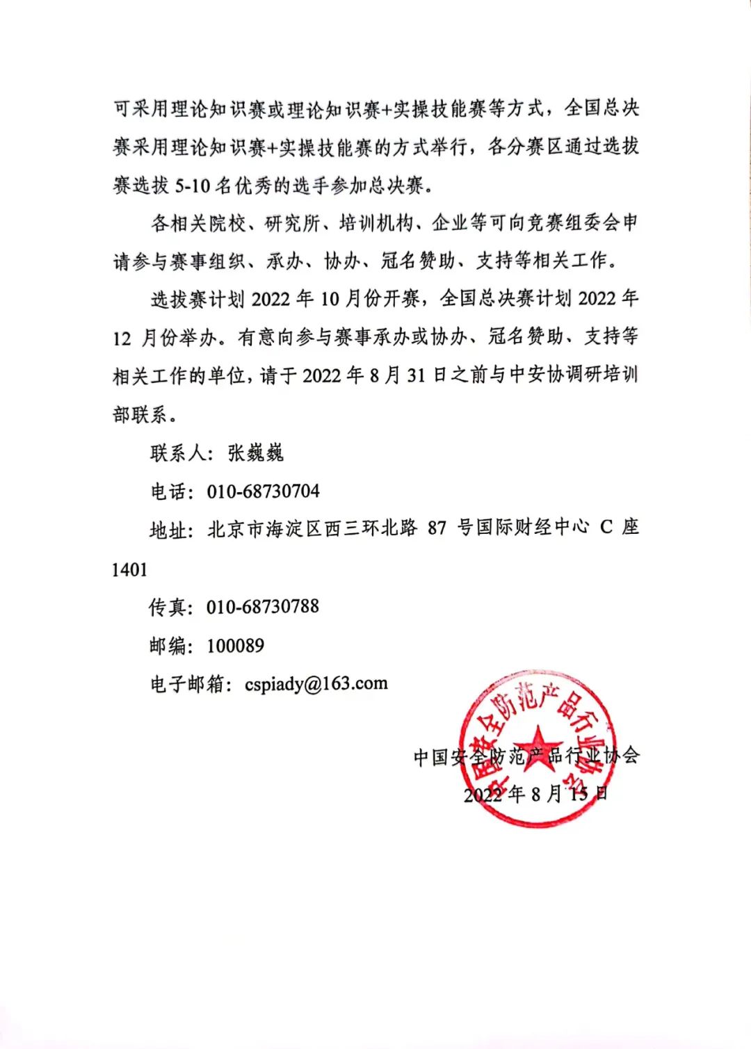 選拔賽計劃2022年10月份開賽,全國總決賽計劃2022年12月份舉辦。 有意向參與賽事承辦或協辦、冠名贊助、支持等相關工作的單位,請于2022年8月31日之前與中安協調研培訓部聯系。
