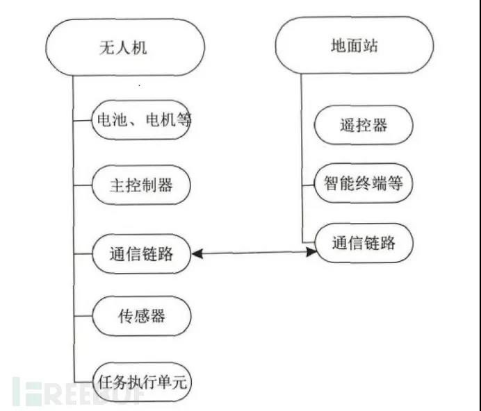 無人機系統主要由三部分組成,包含無人機、地面站以及傳輸信息的通信鍊路組成。其中,無人機部分包含動力系統、主控制器、通信鍊路模塊、傳感器、任務執行單元。地面站部分包含遙控器、智能終端、通信鍊路模塊。控制命令通過地面站傳輸到無人機,無人機采集的數據及其運行數據也會傳輸到地面站。通信鍊路部分包括無人機與地面站之間的通信鍊路、衛星通信鍊路和無人機到無人機通信鍊路。