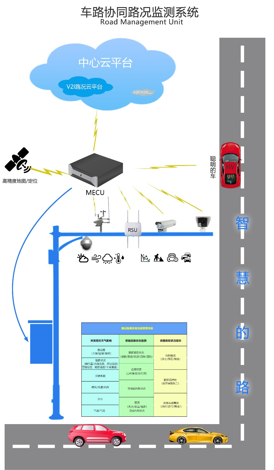 是一種集自動駕駛道路環境多要素融合感知、MECU(Mobile Edge Computing Unit)邊緣計算、高精度定位結合、通信傳輸及“路況雲”平台管理于一體的路況監視系統,可實現惡劣天氣狀況提醒、基礎設施狀态監視和道路危險狀況提示等V2I場景解決方案。構建“持續監控、及時預警、智慧決策”的智慧道路體系,為自動駕駛汽車道路行駛安全提供預警決策支撐。